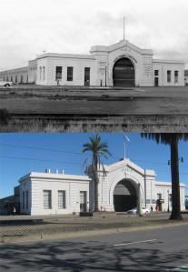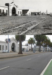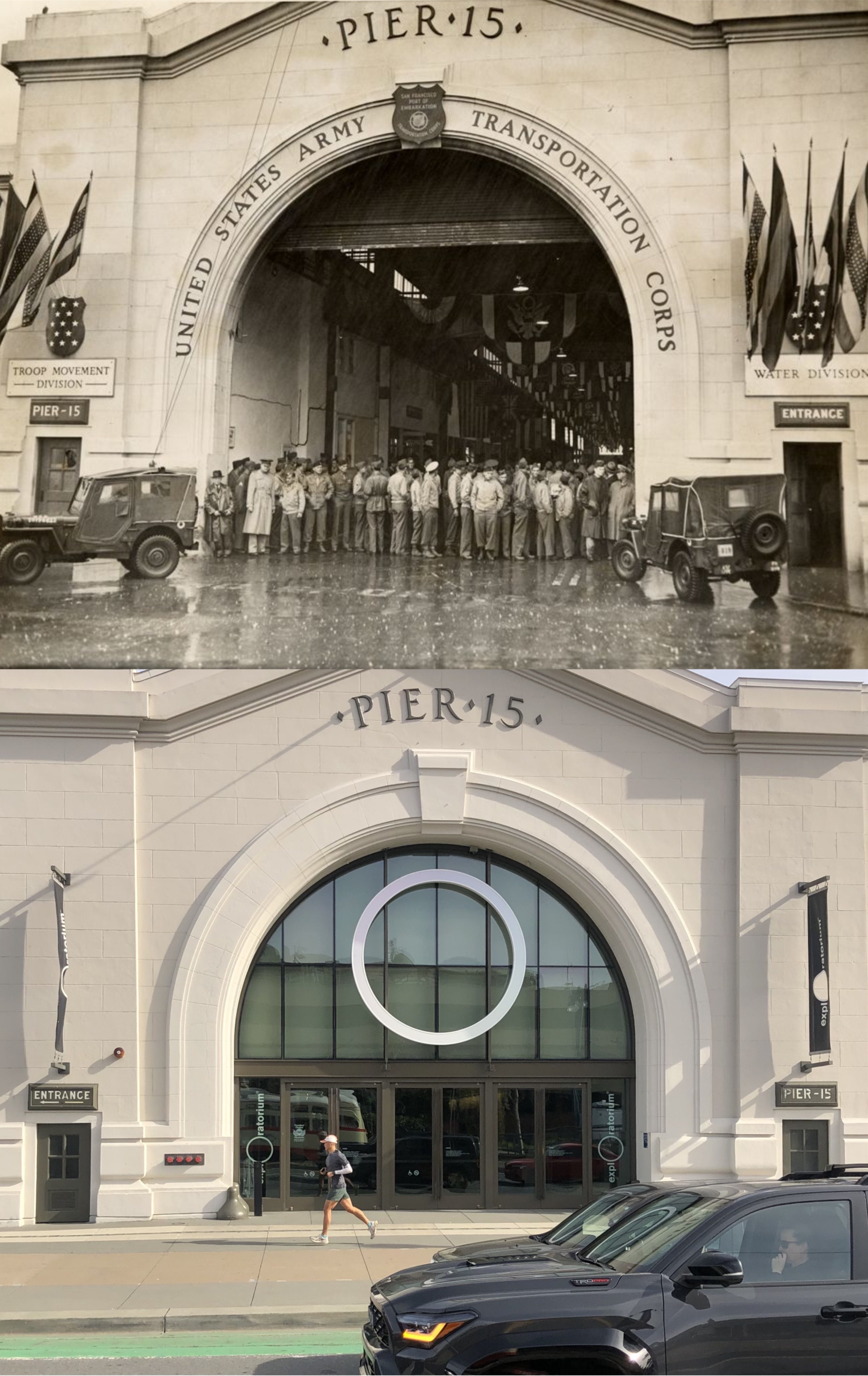 #7 Pier 15, just after World War Two in 1946: The Exploratorium now occupies Pier 15. I was taking an F Line Streetcar break to Pier 39, that came along near here yesterday while I was finishing my set, but you can’t see me in the streetcar reflection. (San Francisco Library Digital Archives)