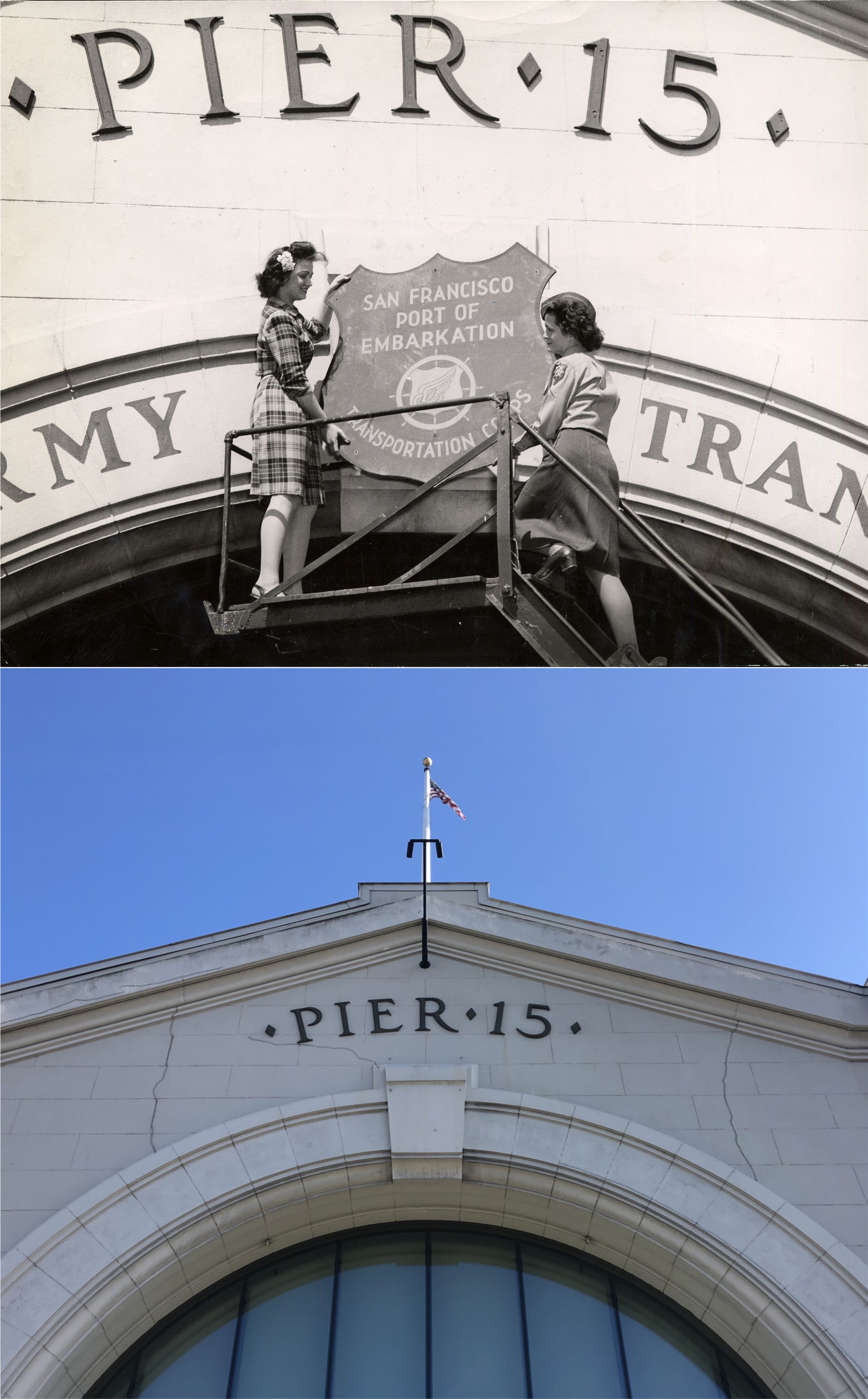 #8 Ladies removing the military Port of Embarkation sign on the top of Pier 15 in 1946: (San Francisco Library Digital Archives)
