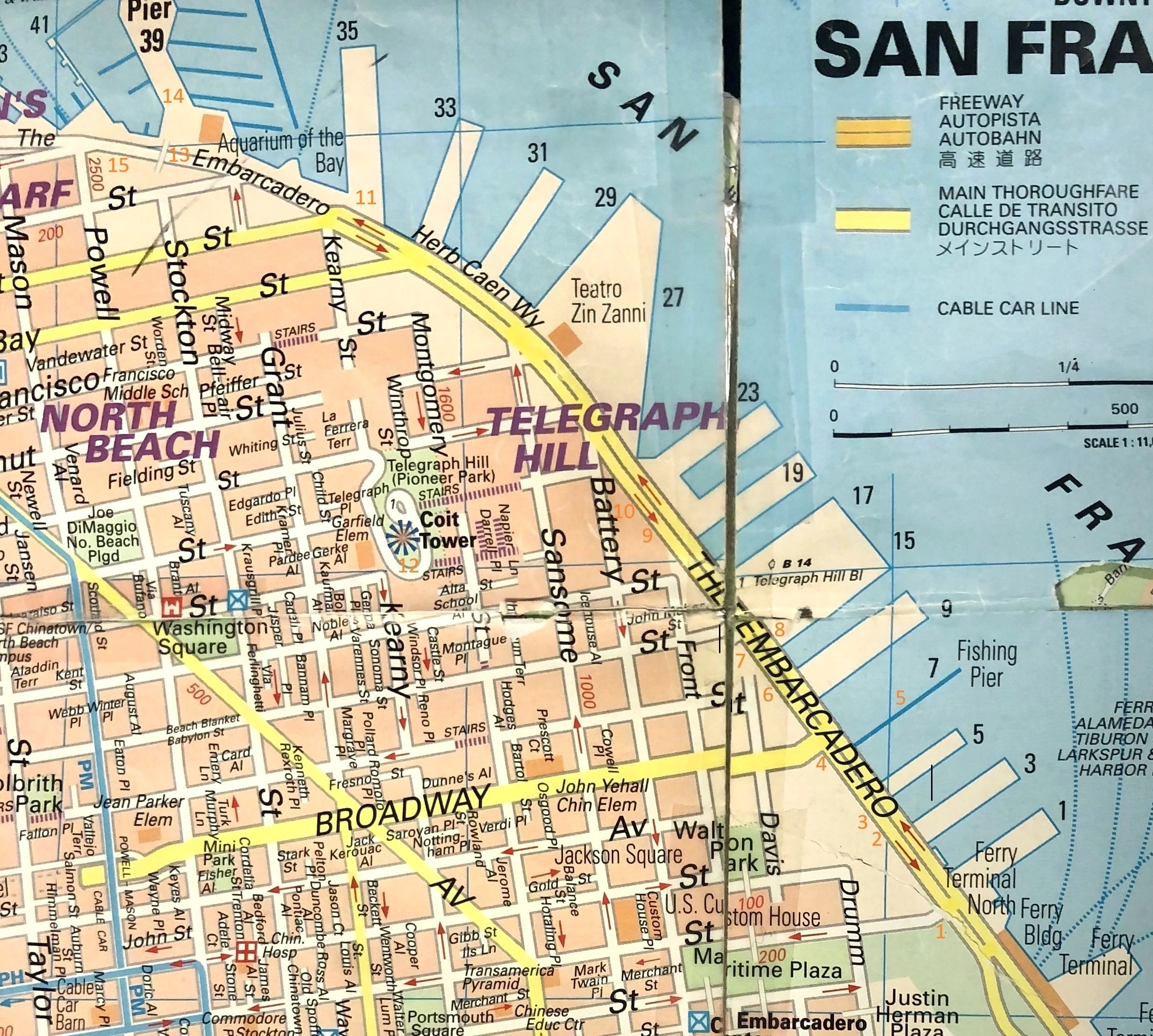 This is another follow-by-the-numbers tour of what’s probably my favorite San Francisco street; courtesy of my trusty City in Your Pocket San Francisco Map that I probably used a lot to get around SF before Google Maps came along. It’s dated 2011 and scotch tape has kept it from disintegrating, but I hold on to it for nostalgia reasons. Also, I always liked the fact that the streets and roads on the entire map are streets and roads, and not just lines. Sometimes little things like that are important to me. You can follow along on my tour with the orange numbers where my updated pictures were taken; the numbers in black from my old map designate the numbers of the piers . We’ll start near the Ferry Building at Pier 1, and proceed north by northwest. (Sorry, Mr. Hitchcock) Although it’s lost its mystery, danger and intrigue, you can still feel a sense of the Embarcadero’s past when you walk along these piers, especially at night, or see it in old film noir movies or television shows like “Harbor Command’ or ‘San Francisco Beat’ or read about the port in books, both fiction and non fiction. (Thumbnail images)