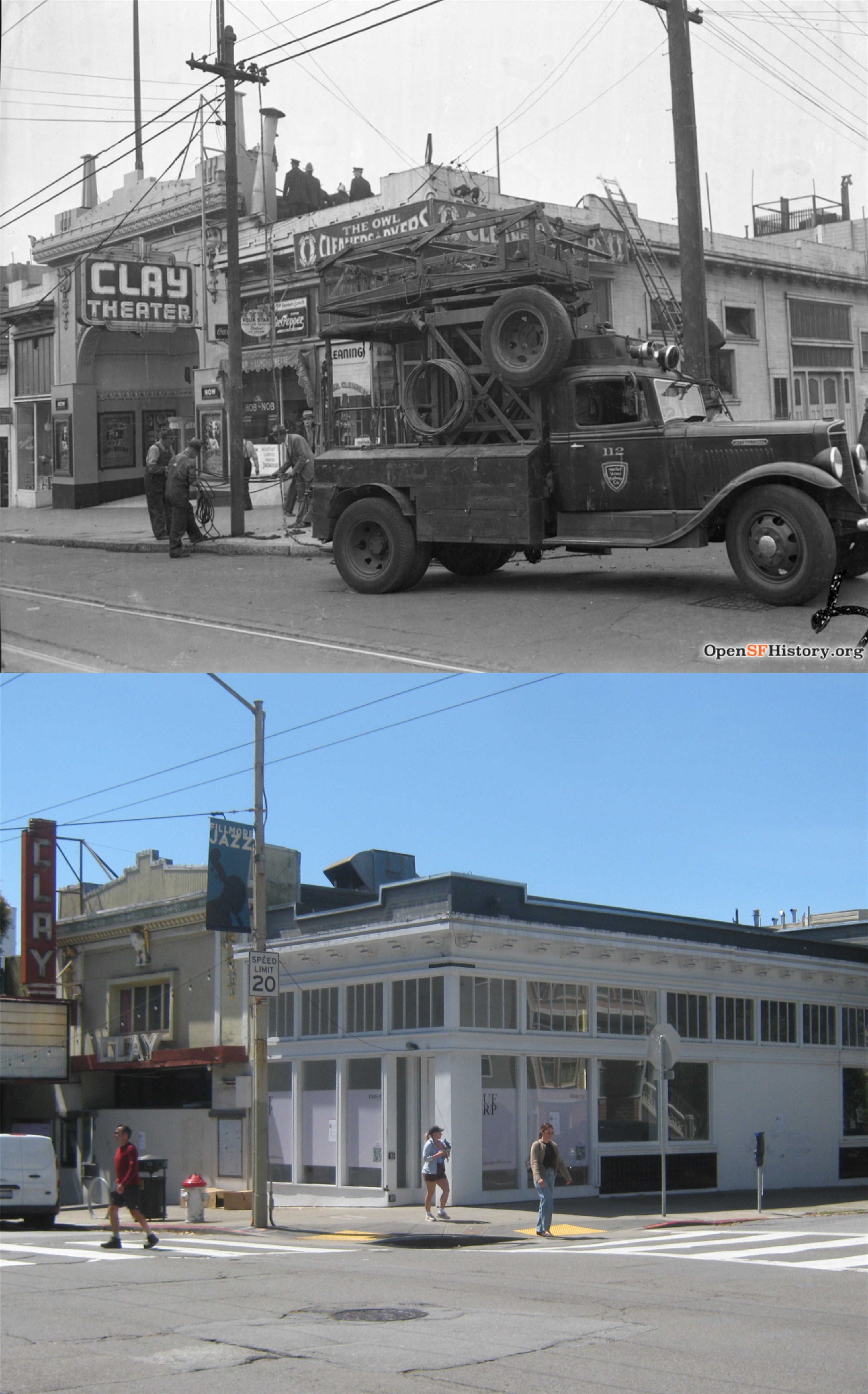 A view from the corner of Clay and Fillmore Streets of the fire damage to the Clay Theater: Opensfhistory.org states that the fire was in September of 1940, not October of 1940. I don’t know about that either.