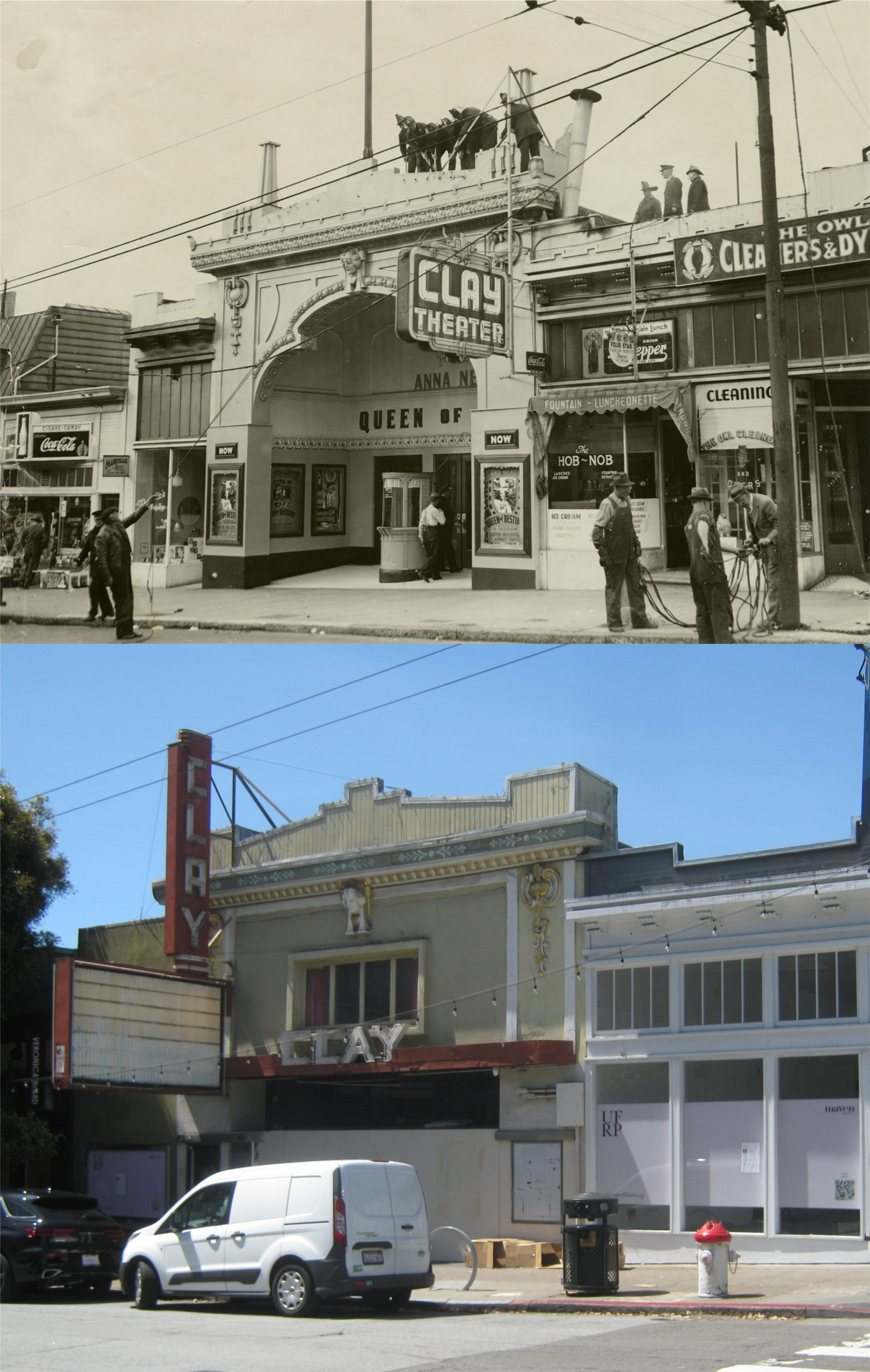 An article in the April 6th San Francisco Chronicle concerning the restoration of the old Clay Theater on Fillmore Street, refers to the Clay as the oldest theater in San Francisco. I didn’t know that! There seems a little controversy concerning this; Wikipedia and AI state that the Clay theater opened in 1913, which would make the Roxie Theater in the Mission District, opened in 1912, the oldest movie theater in San Francisco. However, Cinema Treasures states the the Clay Theater opened in 1910, which backs the Chronicle’s claim. Anyway, I’ve never been to the closed up theater so, I took Muni #1 out to Fillmore Street today to take some pictures of the historic movie house. (Thumbnail images)