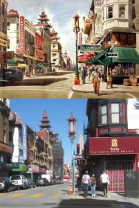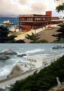 The view down Broadway from Russian Hill in 1952: The rectangle structure in the center of both pictures is the eastern entrance and exit to the Broadway Tunnel, which opened up in 1952. That building with the red, white and blue colors on the right in my picture almost looks like an optical illusion. (opensfhistory.org)