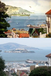 One of the prettiest and least visited view spots in San Francisco is Ina Coolbrith Park on Russian Hill. In the vintage picture from the early 1970s, none of the Embarcadero Center buildings have been erected yet, except for possibly the Hyatt Regency Hotel. (clickamericana.com)