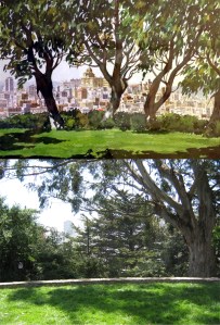 The view from Pioneer Park behind Coit Tower, circa 1945: You’ll spot the Bay Bridge and Ferry Building a little easier in the vintage picture than in my rainy redo. That was probably fog in the old picture. (opensfhistory.org)
