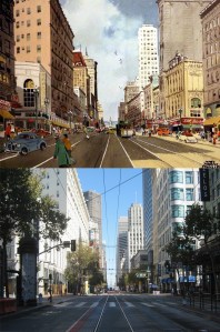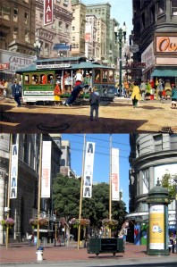 Where Powell Street crosses California Street on Nob Hill: I couldn’t get a date on the vintage picture, but it looks like the mid 1970s. (clickamericana.com)