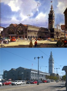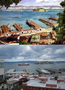 The view from Pioneer Park behind Coit Tower, circa 1945: You’ll spot the Bay Bridge and Ferry Building a little easier in the vintage picture than in my rainy redo. That was probably fog in the old picture. (opensfhistory.org)