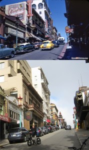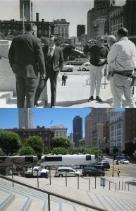 Market Street, where Turk and Mason Streets come in to it in 1968. On the ground floor of the building on the right with the Coca-Cola sign was where the ‘Pepsi-Cola Center for Servicemen’ Center for those in the service during World War Two was located.
