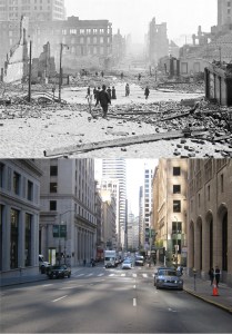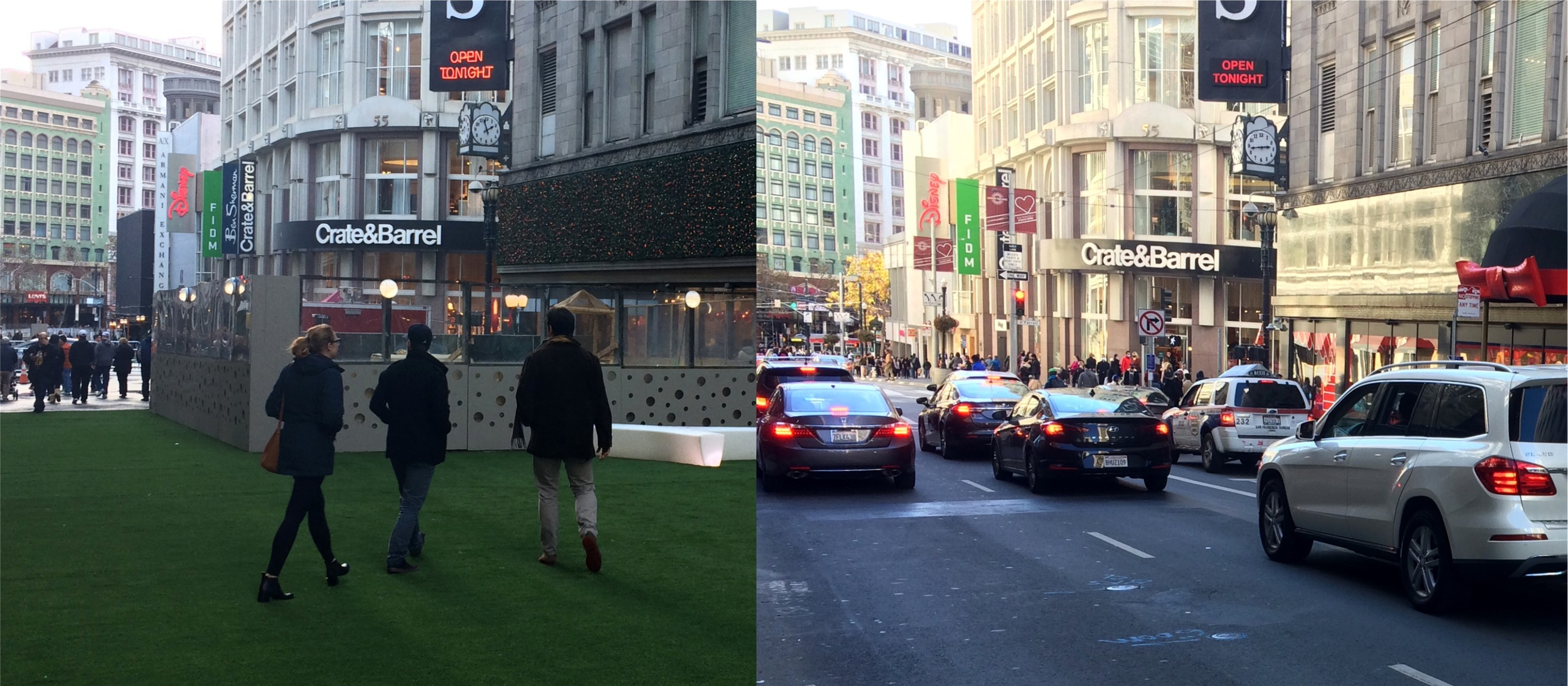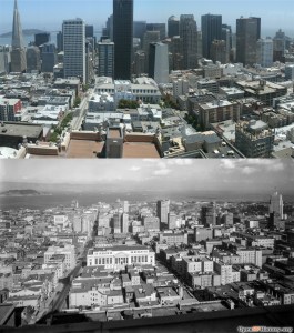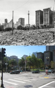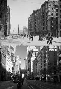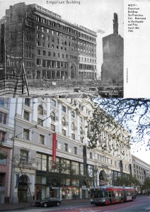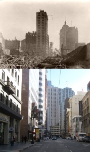 Looking across Market Street toward the Number One Powell Street Building; looks like the early 1960s. There’s a lot of interesting things to see in the vintage picture, including an Eddy Street sign on Powell, and also a rare comparison in 2020 that has a cable car in both pictures. (etsy.com)