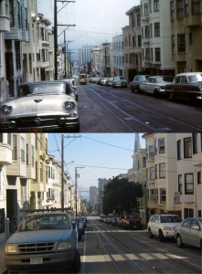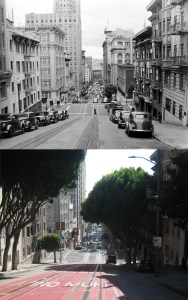 I’m not sure if I like this painting from the 1970s looking down Powell Street toward the Sir Francis Drake hotel, or not, but it is interesting. Few of the buildings in the work match up to the actual buildings there, and if that’s supposed to be Telegraph Hill with Coit Tower in the background, it isn’t South of Market Street. (ebay.com)